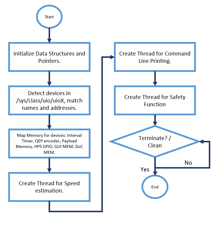 drive_on_chip.c/.h: functions to write and read information from doc_safety_dump memory for visualization of safety parameters in the GUI. Also functions to access any device connected to the lightweight HPS to FPGA bridge, if necessary, e.g. changing the speed of the axis.fpga_speed_est.c/.h: functions to clear the over speed latch in the FPGA channel after safe state clearance.hps_gpio.c/h: functions to read and write to the hps_fpga_gpio to provide HPS safety outputs to the external safety logic (speed comparison and over-speed) and receive the output of the of the external safety logic (motor power down). Routines to indicate safe state to the external safety logic from the HPS safety channel.interval_timer.c/h: functions to control the interval timer, set free running, clear timeout signals, set the timer count.qep_encoder.c: functions to get the quadrature encoder pulse count for speed estimation.safe_memory.c/.h: functions to write and read information from the share memory (shared_mem) and to cross compare payloads produced by both safety channels.scan_devices.c/h: a set of helper functions to determine the location, name, addresses, and offsets of the required devices. Also to get a pointer to handle the access to base memory. Devices must be mapped in the DTS as UIO devices.