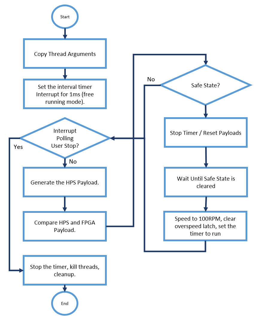 In every interrupt by the timer the application copies an HPS channel speed estimation from the speed estimation thread. The program generates and copies the payload to the shared memory. Then it compares the latest with the payload available from the HPS safe channel. The HPS asserts the safety signals and writes to registers for the FPGA-HPS channel synchronization. If the safe state is triggered, the motor is stopped. The safety function pauses until you clear the state with the push button. Then the function continues with the regular activities for safe speed monitoring in Axis0.