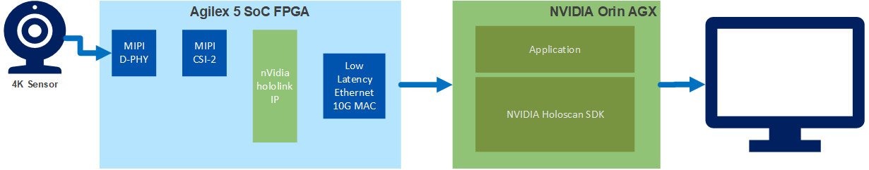 The Holoscan Sensor Bridge MIPI to 10GbE System Example Design for Agilex™ 5 Devices demonstrates an implementation of using industry-standard Mobile Industry Processor Interface (MIPI) D-PHY and MIPI CS1-2 interface on Agilex™ 5 FPGAs to integrate to a Holoscan processing flow.