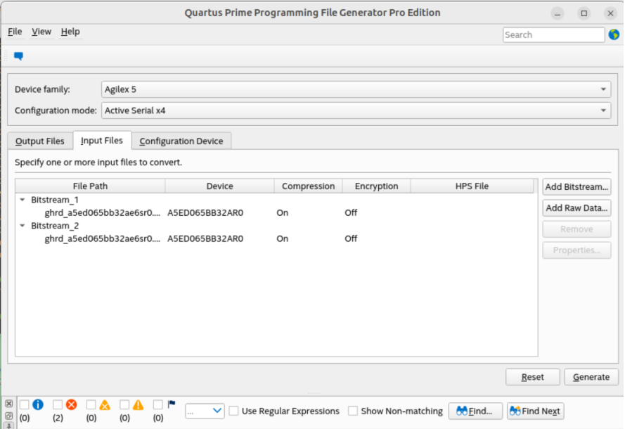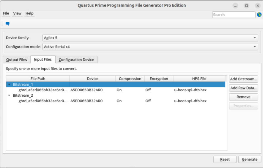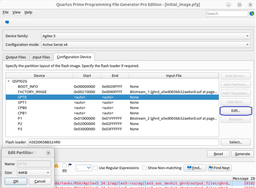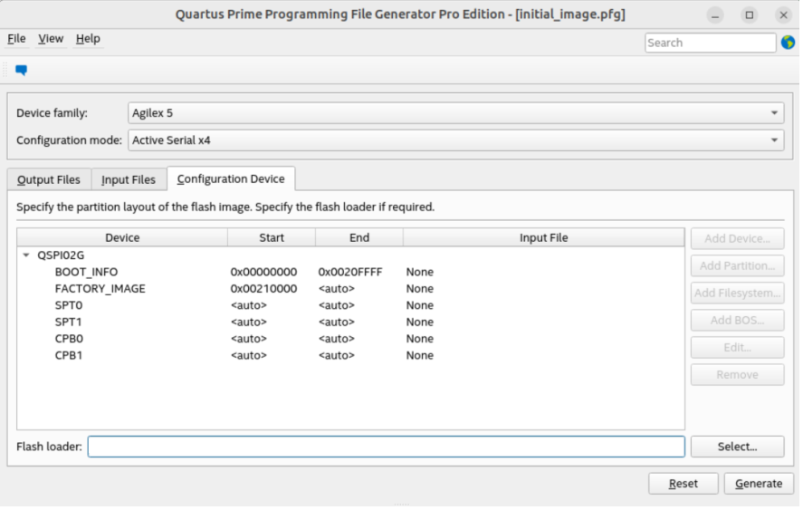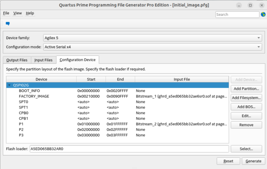 <pfg version="1"> : <raw_files> <raw_file bitswap="1" type="RBF" id="Raw_File_1">u-boot_FACTORY_IMAGE.bin</raw_file> <raw_file bitswap="1" type="RBF" id="Raw_File_2">u-boot_P1.bin </raw_file> <raw_file bitswap="1" type="RBF" id="Raw_File_3">u-boot_P2.bin </raw_file> <raw_file bitswap="1" type="RBF" id="Raw_File_4">u-boot_P3.bin</raw_file> </raw_files> <flash_devices> : <partition reserved="0" fixed_s_addr="0" s_addr="0x04000000" e_addr="0x041FFFFF" fixed_e_addr="0" id="SSBL.FACTORY_IM" size="0"/> <partition reserved="0" fixed_s_addr="0" s_addr="0x04200000" e_addr="0x043FFFFF" fixed_e_addr="0" id="SSBL.P1" size="0"/> <partition reserved="0" fixed_s_addr="0" s_addr="0x04400000" e_addr="0x045FFFFF" fixed_e_addr="0" id="SSBL.P2" size="0"/> <partition reserved="0" fixed_s_addr="0" s_addr="0x04600000" e_addr="0x047FFFFF" fixed_e_addr="0" id="SSBL.P3" size="0"/> </flash_device> <assignments> <assignment partition_id="SSBL.FACTORY_IM"> <raw_file_id>Raw_File_1 </raw_file_id> </assignment> <assignment partition_id="SSBL.P1"> <raw_file_id>Raw_File_2 </raw_file_id> </assignment> <assignment partition_id="SSBL.P2"> <raw_file_id>Raw_File_3 </raw_file_id> </assignment> <assignment partition_id="SSBL.P3"> <raw_file_id>Raw_File_4 </raw_file_id> </assignment> </assignments> </pfg> -