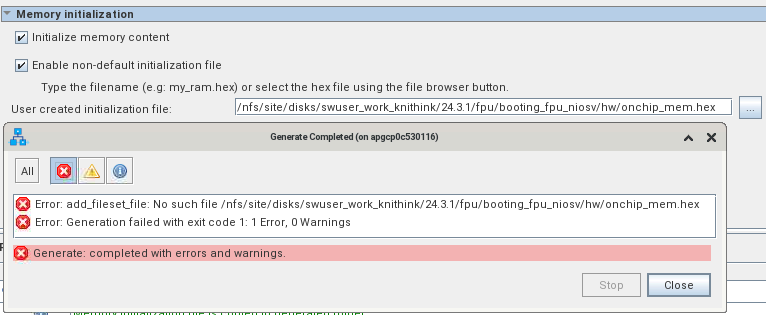 You might experience Generate HDL failure when running the build_sof.py script. This issue is caused by the invalid User created initialization file in On-Chip Memory.