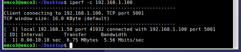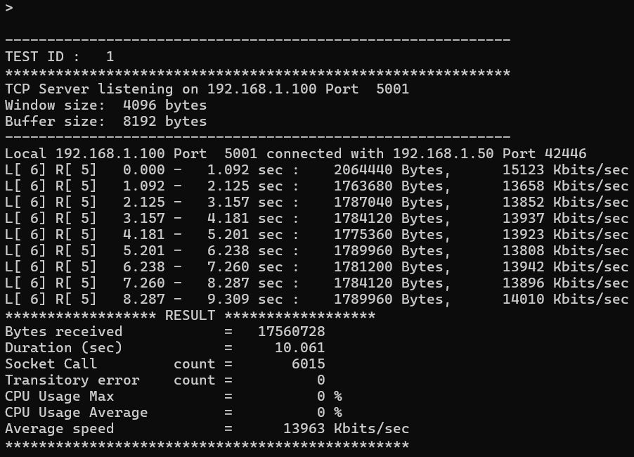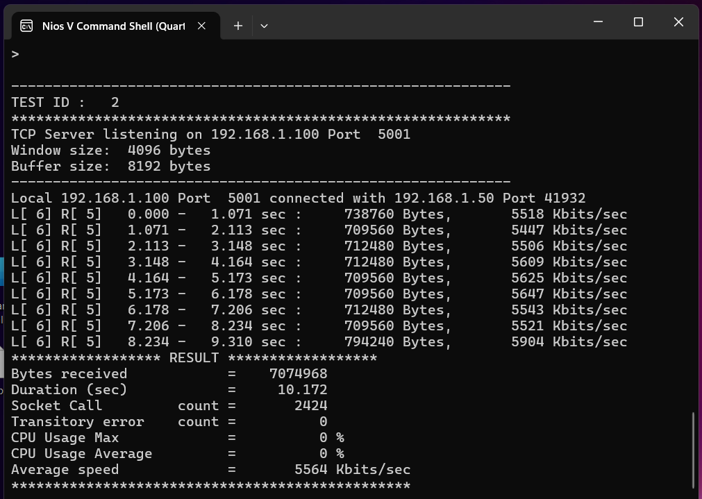 The same IPerf benchmark results is displayed from the IPerf server or FPGA (192.168.1.100).