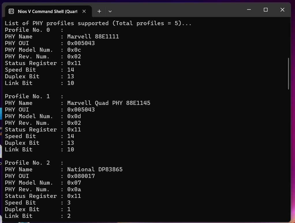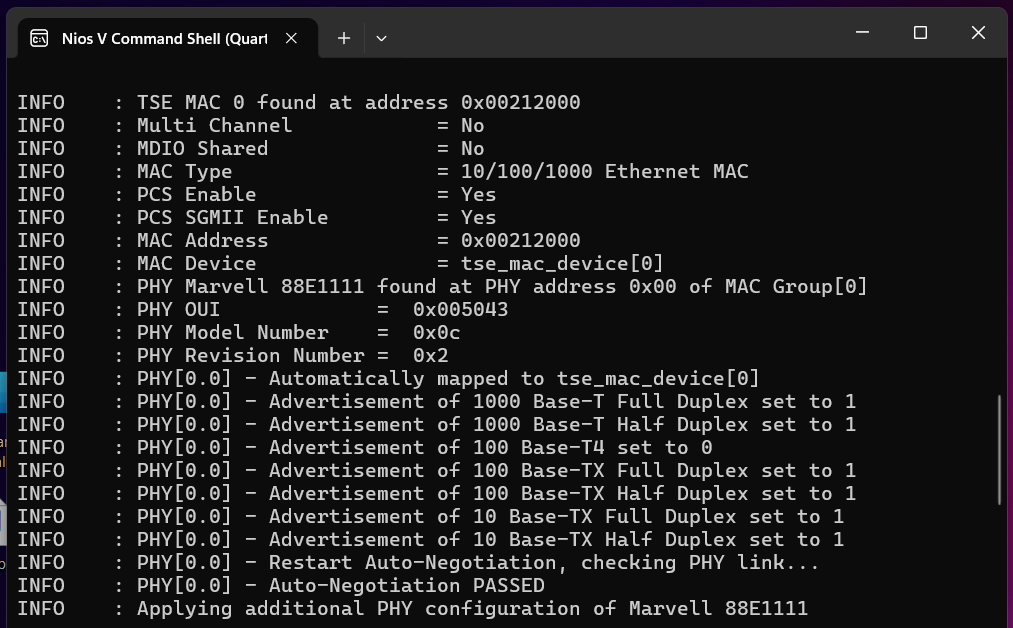 This design demonstrates an IPerf application on a Nios® V/m processor using the Triple Speed Ethernet IP in Agilex™ 7 FPGA F-Series Transceiver-SoC Development Kit (P-Tile and E-Tile). The Triple Speed Ethernet (TSE) IP is configured in SGMII mode and connects to the onboard 80E1111 PHY via SGMII interface. To complement the TSE IP, two Modular Scatter-Gather DMA (MSGDMA) IP with Descriptor Memory to offload Ethernet data transfer tasks from the processor.