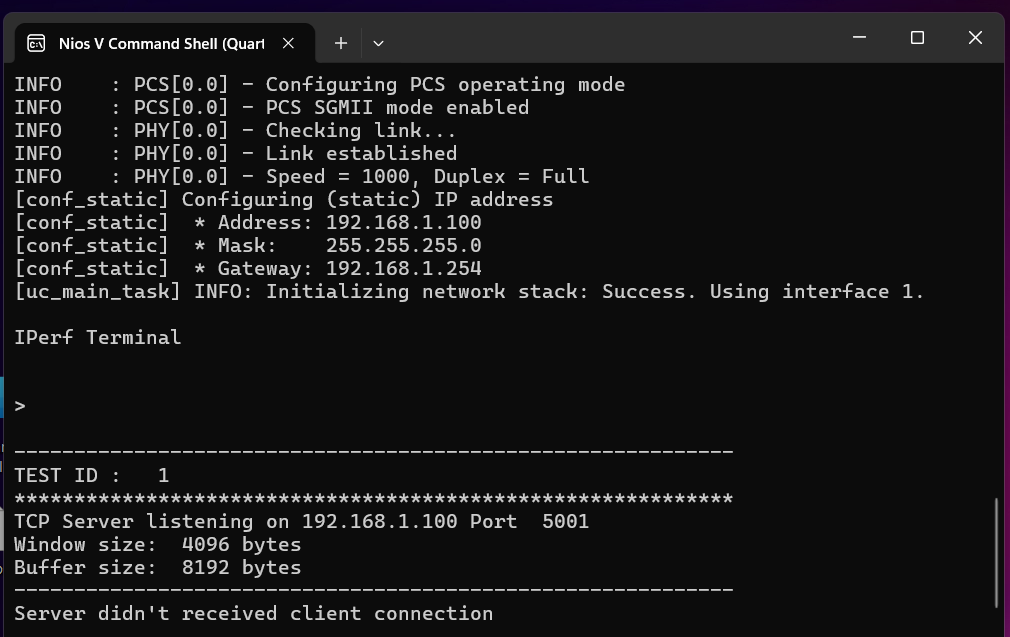 For example, you should see similar display at the start of the server application, with the FPGA IP Address as 192.168.1.100. The FPGA is running as an IPerf server, waiting for a valid IPerf client connection.
