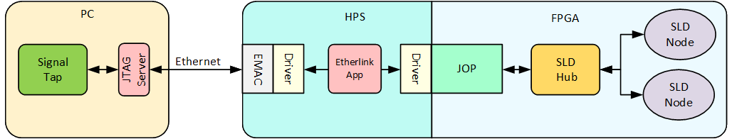 Th Etherlink application runs on HPS, accesses the JOP component slave bus to access the debug information, and provides a TCP/IP link from the host PC running the Quartus Pro debug tools to the board.