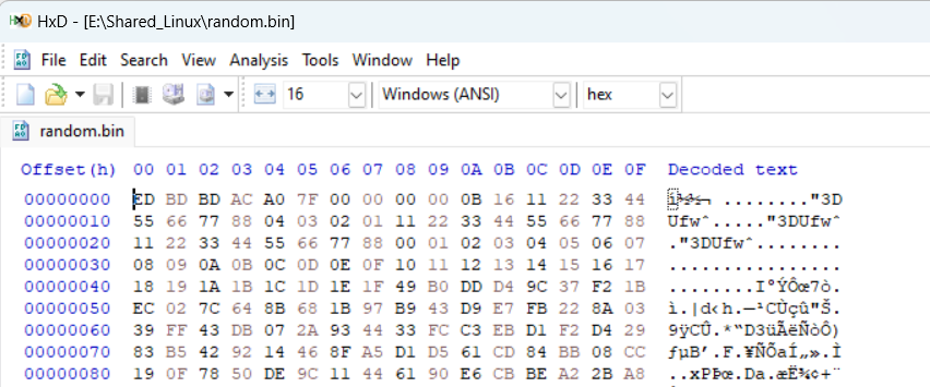 Once the randm.bin file is created, we need to modify this file to include the sdos header at the top of it. Any hex editor can help us on that task, as seen in the image below.