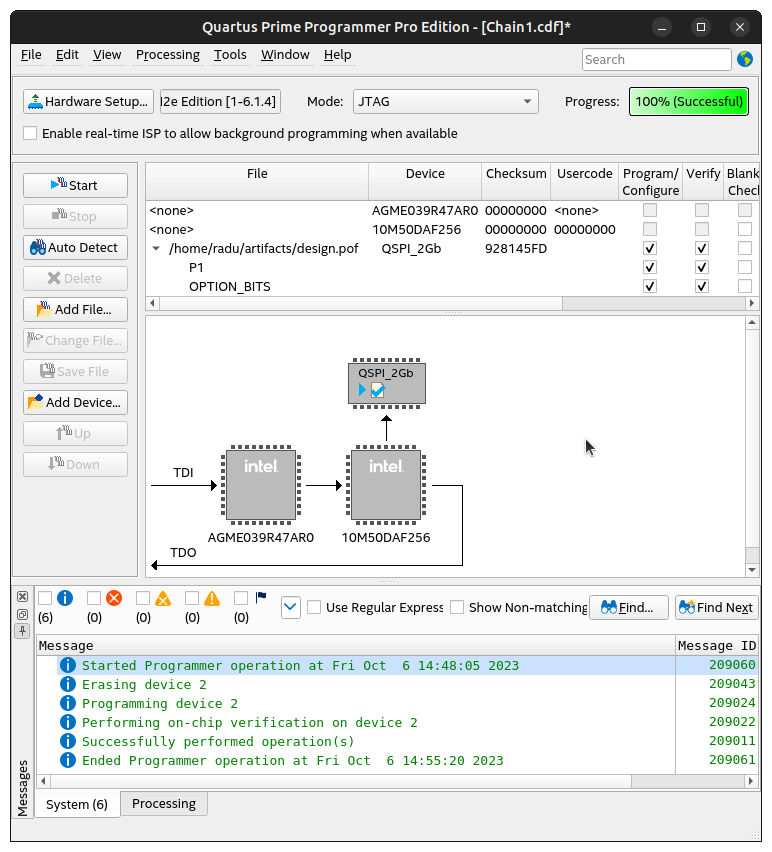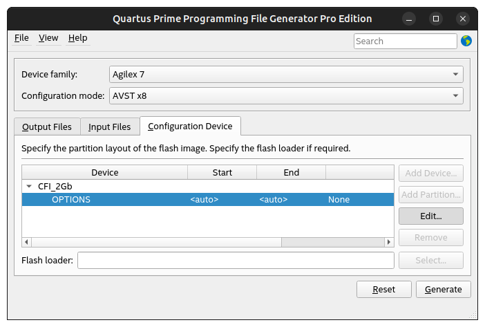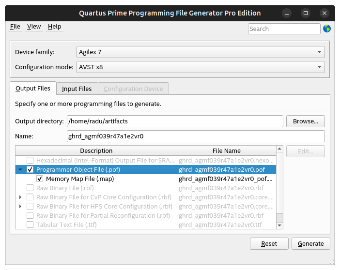 1. Create the PFG file (optional, PFG file already provided here: ghrd_agmf039r47a1e2vr0.pfg) 2. Create the POF file, using the above PFG file 3. Create the CDF file, used by Quartus Programmer to know how to write the POF file 4. Write the the POF file to MAX10 board controller flash, using the Quartus Programmer 5. Configure board through AVSTx8
