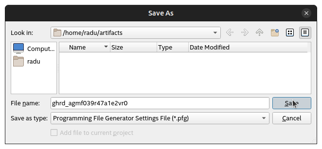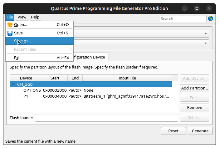 8. Go to File > Save menu and save the configuration file as "ghrd_agmf039r47a1e2vr0.pfg"