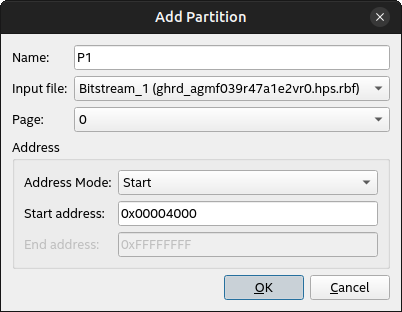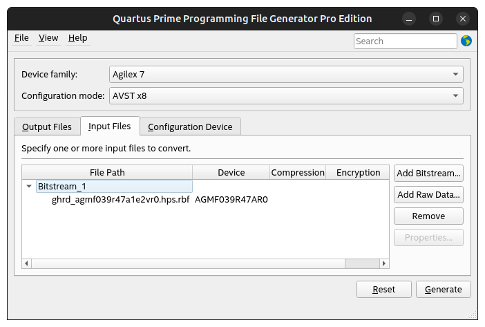 3. Click on the Input Files tab, then click on Add Bitstream... , then select Files of type to be "Raw Binary File (.rbf)" then browse to the ghrd_agmf039r47a1e2vr0.hps.rbf file and click **Open*.