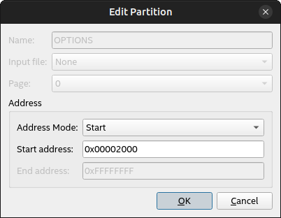 Caution: Please use the addresses 0x00002000 for OPTIONS and 0x00004000 for P1, as they are required by the MAX10 board controller.