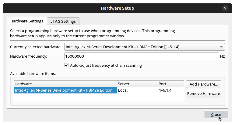 - Currently selected hardware: Intel Agilex™ M-Series Development Kit - HBM2e Edition