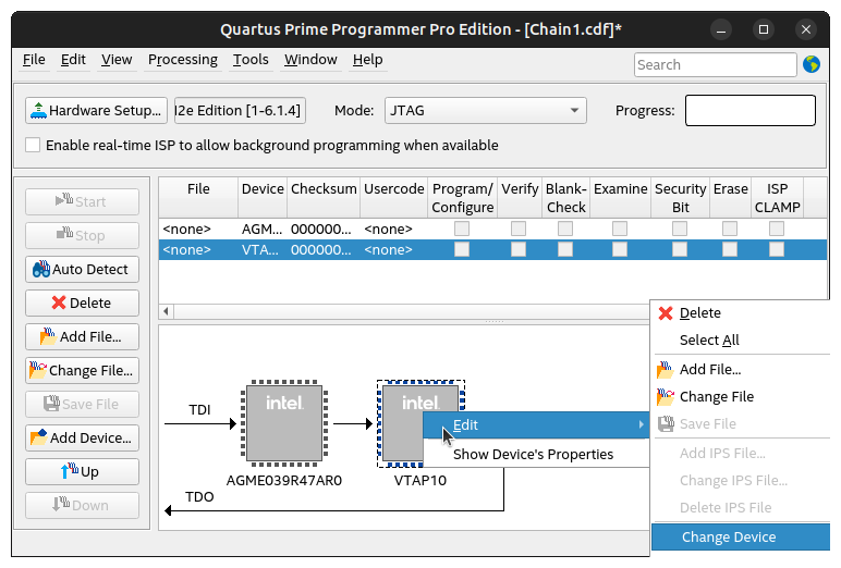 6. In the Programmer window, select the VTAP10 device, then right-click it, and select Edit > Change Device