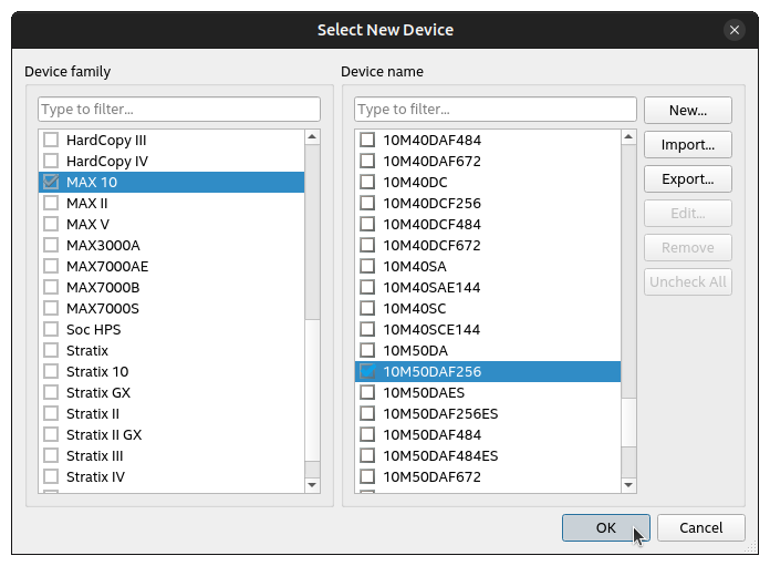 Select the MAX 10 > 10M50DAF256 device then click OK.