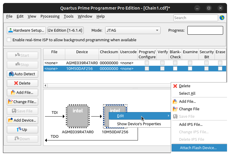 7. Right click the MAX10 device, and select Edit > Attach Flash Device