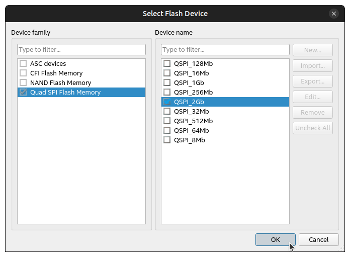Select Quad SPI Flash Memory > QSPI_2Gb option and click OK