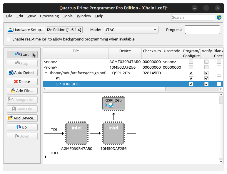 The provided ghrd_agmf039r47a1e2vr0.cdf) file contains the configuration required for the Quartus Programmer to be able to write the POF file to the QSPI attached to the MAX 10 Board Controller.
