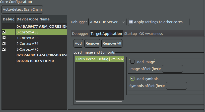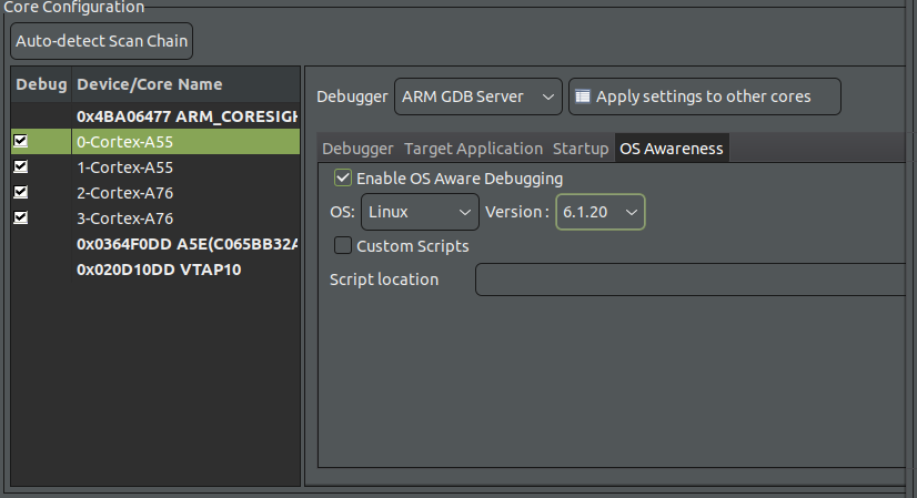 10. The Debug Configurations window will be opened, with the Linux Kernel Debug configuration selected. If not automatically selected, select the Debug probe from the drop down list, then Auto-detect Scan Chain. Then check all the four Arm cores, to enable debugging for them. The window should look like this: