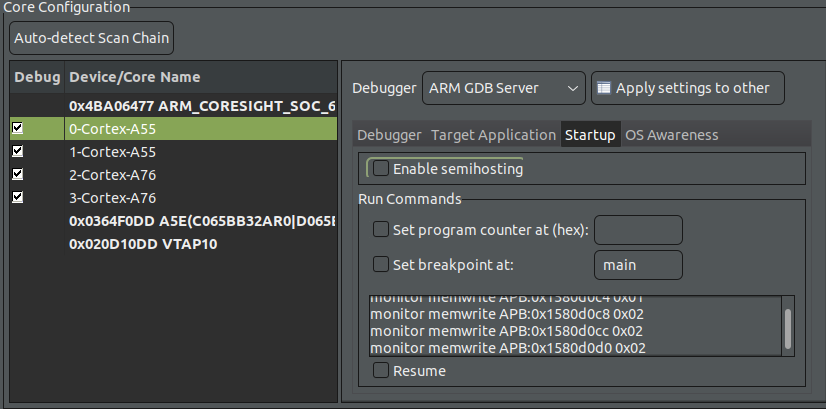 11. Click on 0-Cortex-A55 core, and enter the following commands in the Commands section: