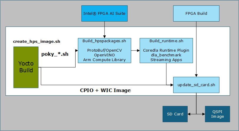 The main entry point into the example design build system is the FPGA AI Suite design example utility (dla_build_example_design.py). This utility coordinates different aspects of building a design example, from the initial project configuration to extracting area metrics after a compile completes. With this utility, you can create bitstreams from custom AI Suite IP architecture files and with a configurable number of instances.