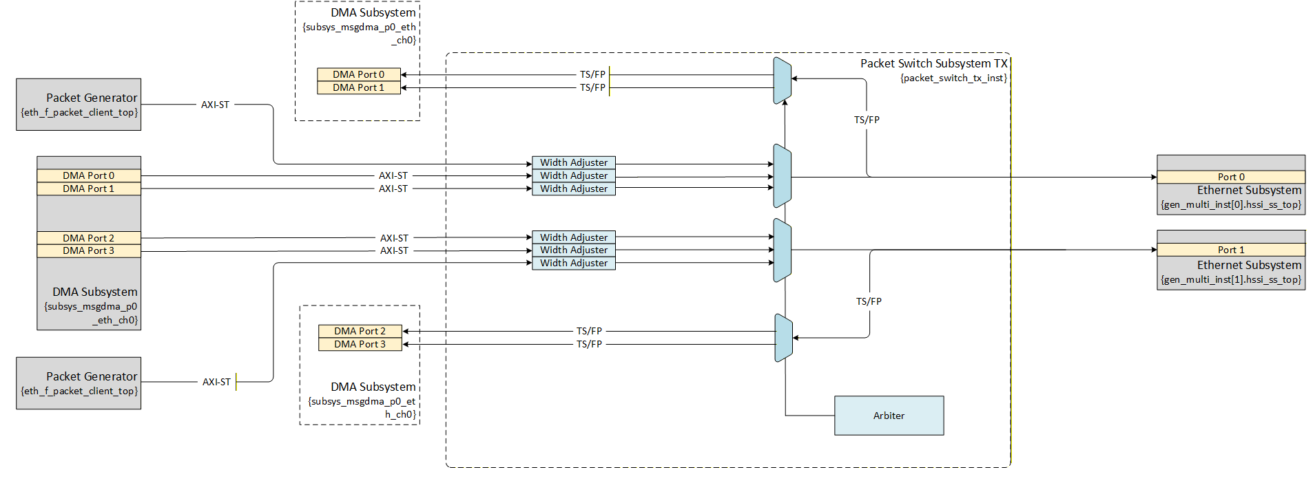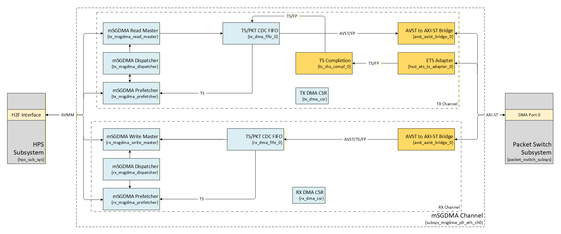 The DMA Subsystem uses mSGDMA engines to transfer data between the HPS and the Ethernet Subsystem. It includes four DMA Ports, 2-transmit (TX) and 2-receive (RX) for each Ethernet port. These channels natively handle PTP Timestamps and Tx Fingerprints.
