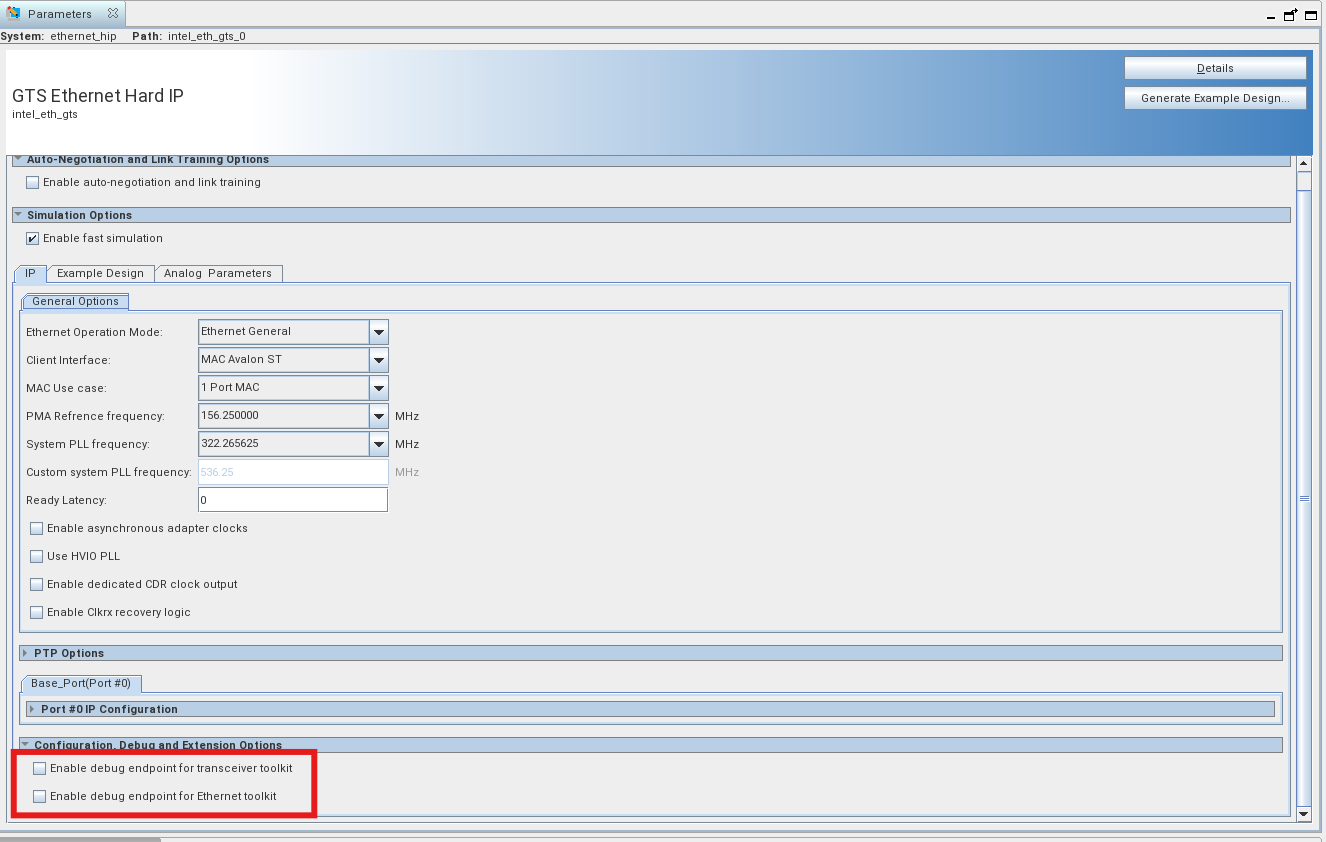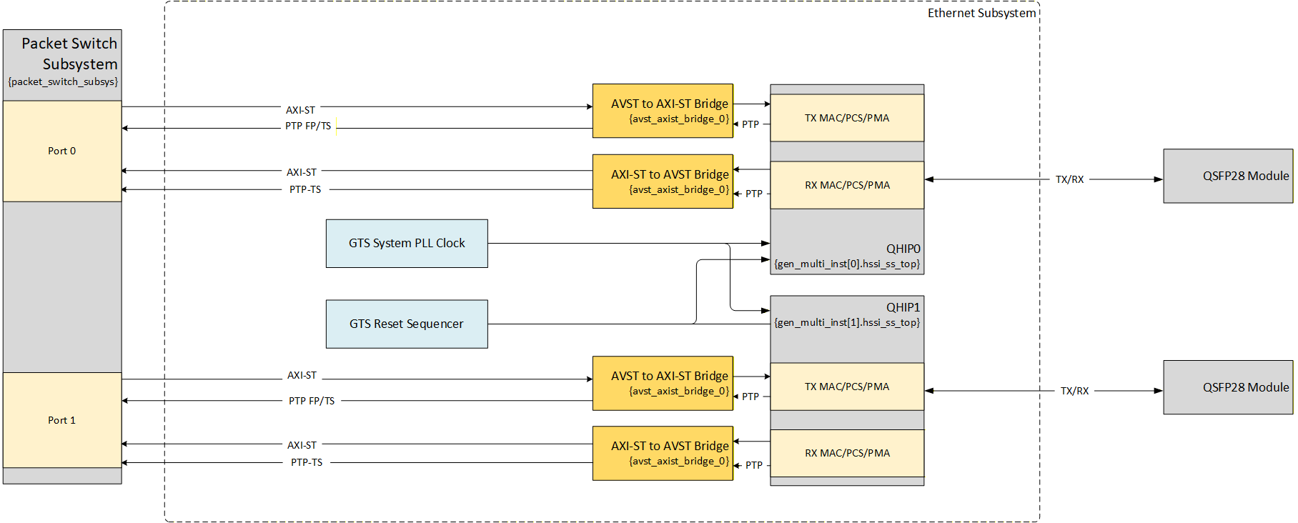 The Ethernet Subsystem instantiates the Agilex™ 5 GTS Ethernet Hard IP . Refer to the GTS Ethernet Hard IP User Guide Agilex™ 5 FPGAs and SoCs for details.