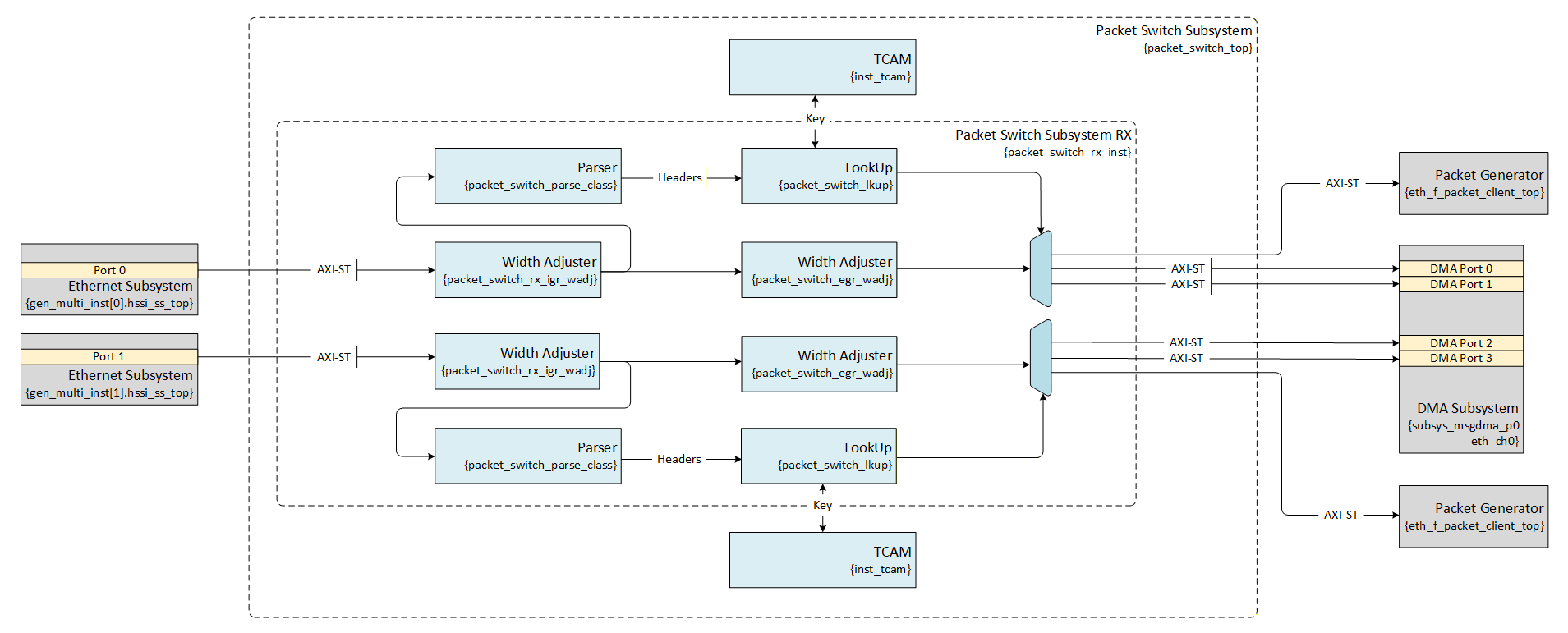 Also, the packet switch are configured to route the packets to intended dma and user port. The key used is a unique combination of SA and DA of eth packet for each of the ports