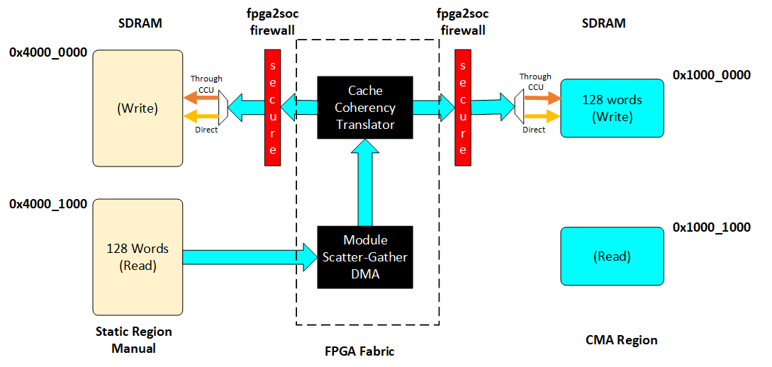 - The interaction with Arm® AMBA® AXI™ Side Band Signal settings required for secure, privileged, and cached transfers from the FPGA using the Cache Coherency Translator IP. This also includes the exercise of the data path that goes from fabric to SDRAM which could go directly to SDRAM or pass through CCU.