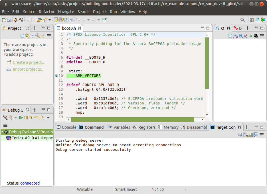 Click the Debug button. Arm Development Studio will run the debug commands, therefore downloading the SPL to board and starting it. The Eclipse window should now look like this: