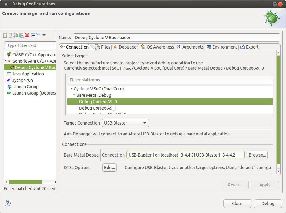 - Go to Select target section and select Intel SoC FPGA > Cyclone V SoC (Dual Core) > Bare Metal Debug > Debug Cortex-A9_0
