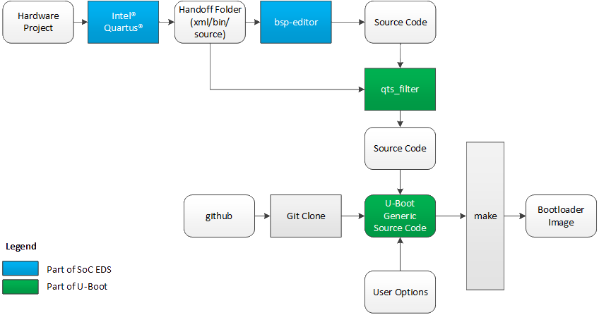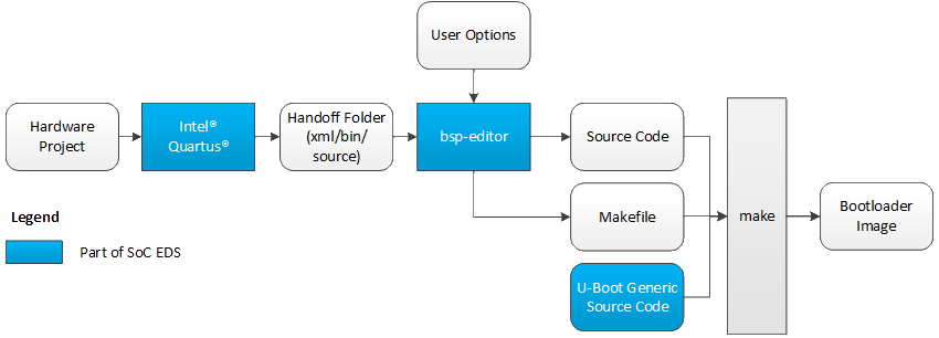 Starting with SoC EDS Pro version 19.3 and SoC EDS Standard version 19.1, the following changes were made: * The bootloader source code was removed from SoC EDS. Instead, the user needs to clone the git trees from https://github.com/altera-opensource/u-boot-socfpga. * The same U-Boot branch is used for all SoC FPGA devices: Cyclone V SoC, Arria V SoC, Arria 10 SoC, Stratix 10 SoC, Agilex. * The bootloader generator (bsp-editor) still needs to be used for Cyclone V SoC, Arria V SoC and Arria 10 SoC, but: * Does not support custom user settings anymore. Instead all custom user settings must be done directly in U-Boot (device tree, configuration and source code). * Does not create a makefile which builds the bootloader. Instead the user is notified about this page, which contains instructions on how to build the bootloader.