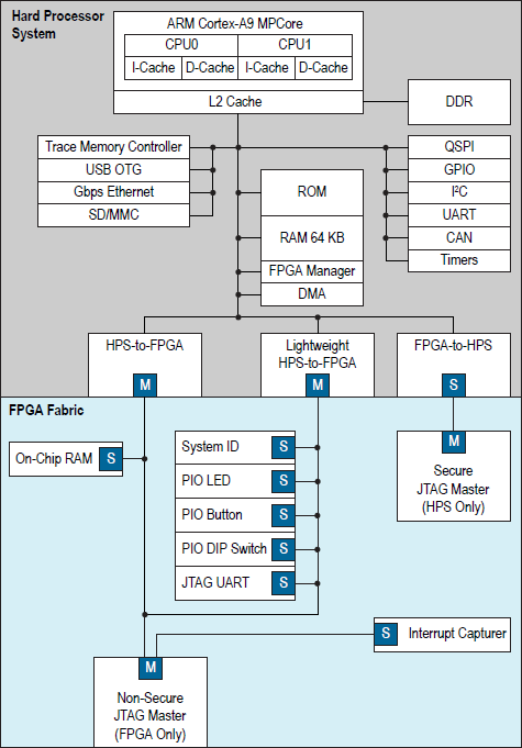 There are two JTAG master interfaces in the design, one for accessing non-secure peripherals in the FPGA fabric, and another for accessing secure peripherals in the HPS through the FPGA-to-HPS interface.