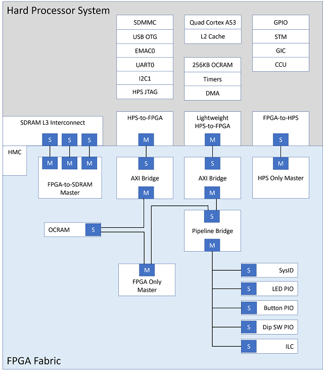 - FPGA Peripherals connected to Lightweight HPS-to-FPGA (LWH2F) AXI Bridge and JTAG to Avalon Master Bridge